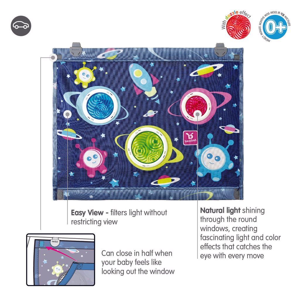 FUN & COLOURFUL – Specially designed to create a fun environment while in the car, our space themed car sun shade for kids provides plenty of visually engaging shapes and colors for your little ones to play and explore while on the go