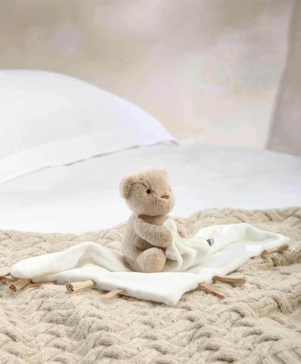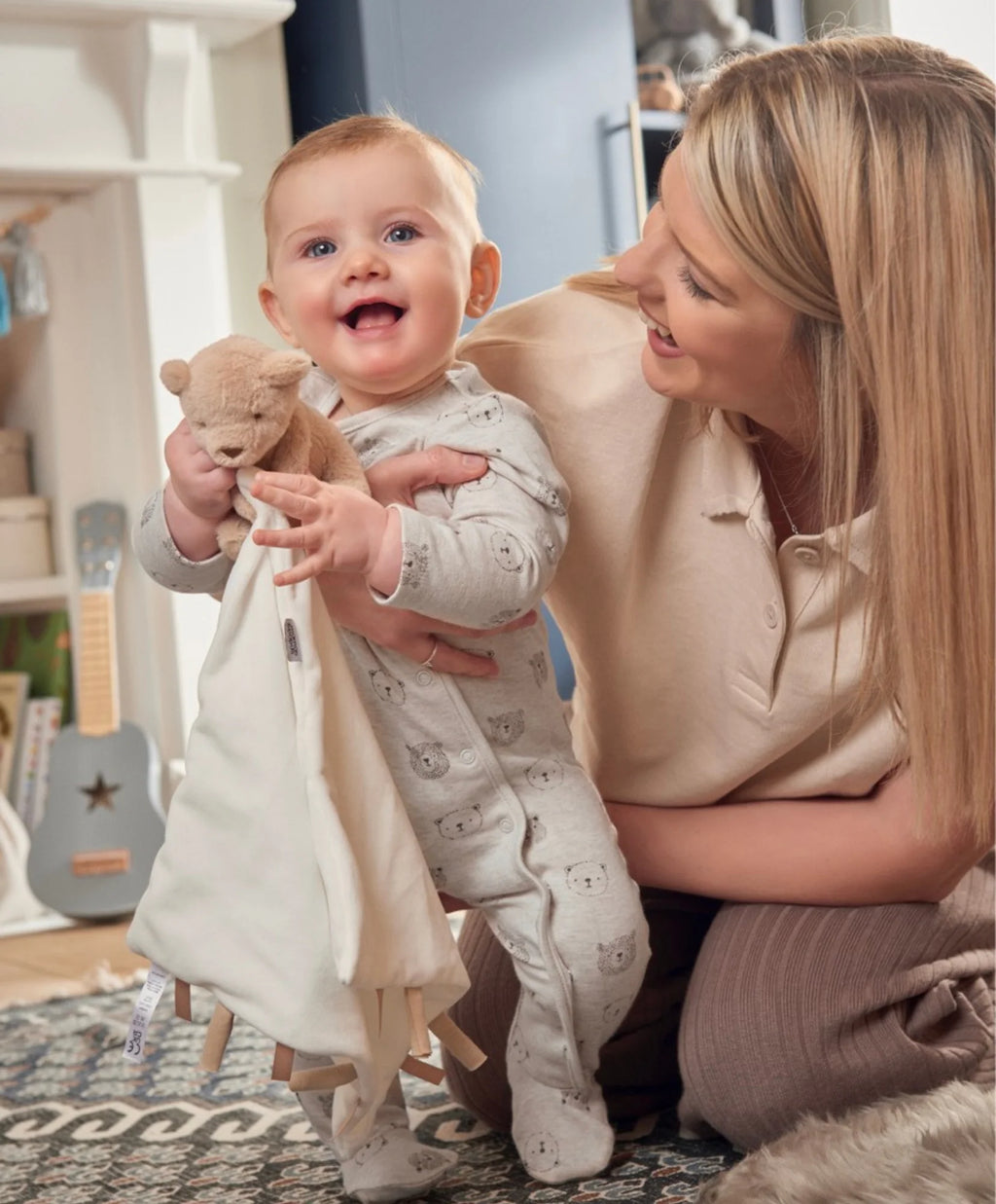 With our Bear Comforter, your child will always have a friendly face nearby. The luxuriously soft comforter is made with gentle faux fur so it's perfect for cuddling up with at nap times. It comes with textured fabric tassels that are ideal for little hands to play with and explore. What's more, you can create the perfect present when you personalise the comforter with baby's name.