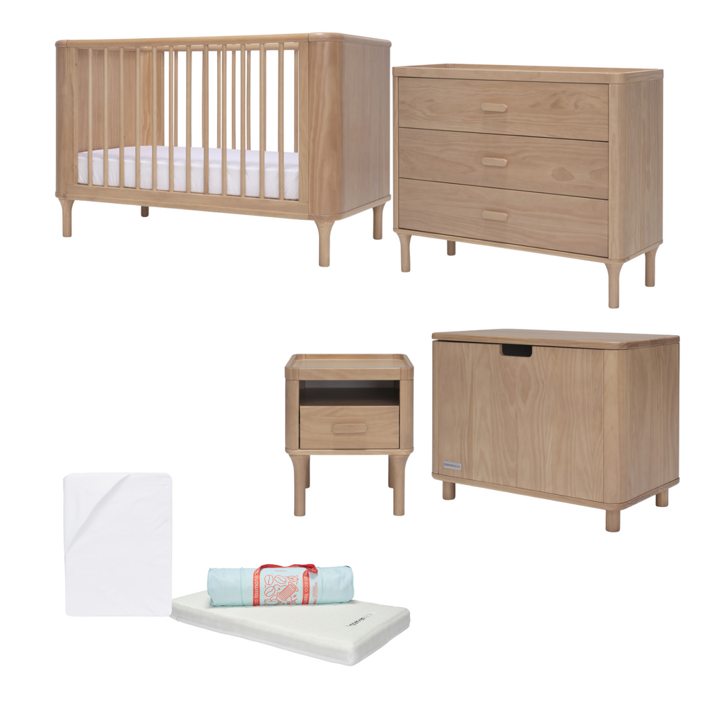 Even being in the industry we found ourselves overwhelmed with choices, where you feel like you need everything. The intention behind this package was to create a base for your nursery. You’re getting a matching nursery set, our DuoDreamer mattress, and a set of manchester. Buying everything together makes the most of our package pricing.