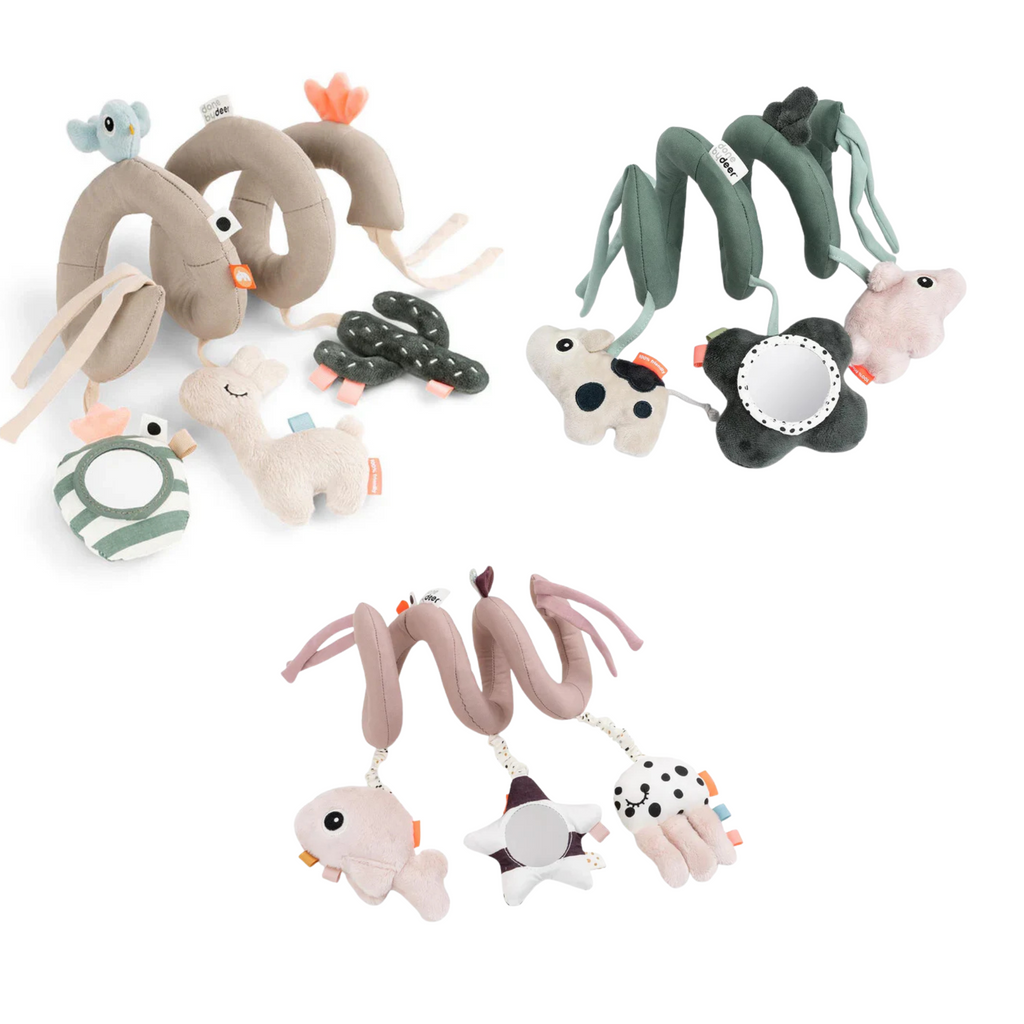 This Activity Spiral is one of the best and most popular baby toys from Done by Deer. It fits on the pram, the cot, the car seat, has a variety of toys as well as a teething ring to stimulate your baby plus it looks super cute.