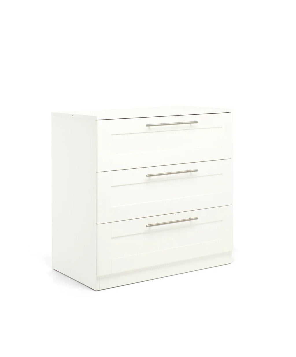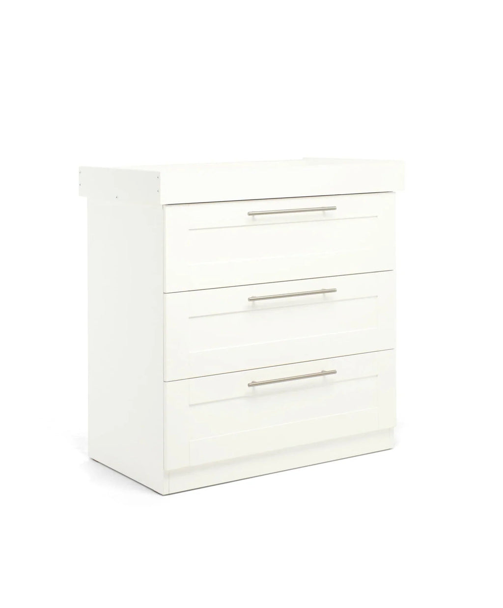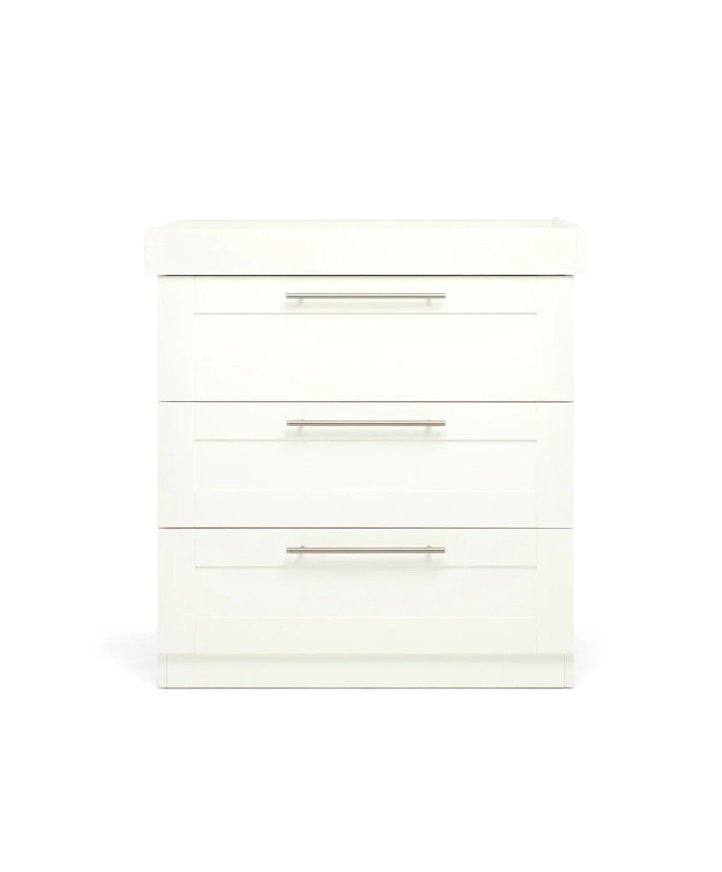 Our Hampden Dresser-Changer offers plenty of storage space to organise your baby’s things, with 3 deep drawers for all your baby’s essentials, sleepsuits and clothes. With a clever 2-in-1 design that allows you to save on space, it features a removeable changing top, giving you a convenient place to change your baby. And when your little one no longer needs their changing top, simply remove and you’re left with a beautiful dresser. In the same minimalist design as the Hampden cotbed, with soft white finish and modern metal handle detail.