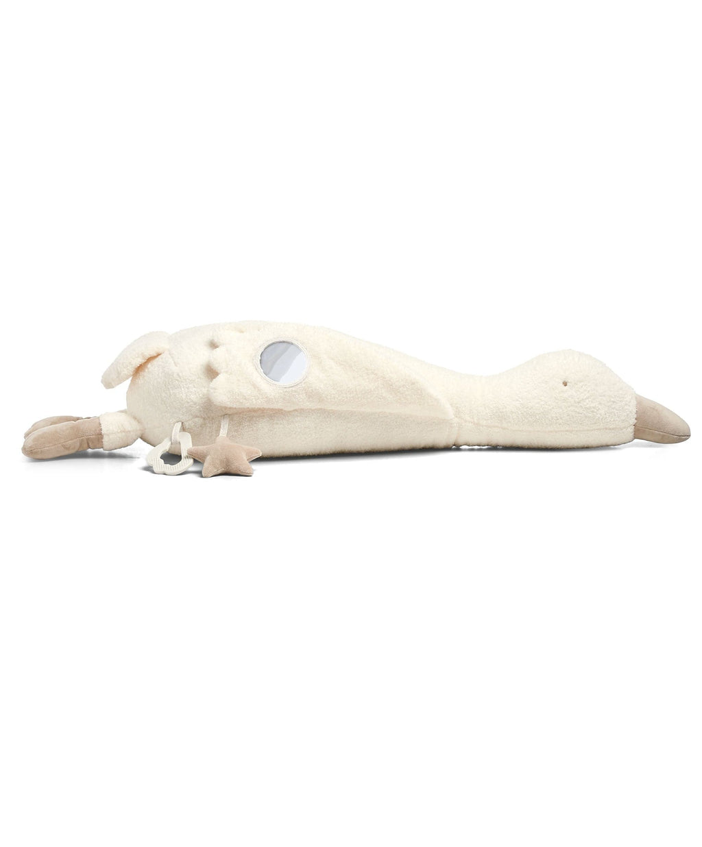 Large duckling ‘tummy time’ toy. With lots of soft padding for baby to use as a support as they start to explore lying on their tummy awake, developing and gaining strength. Our Duckling is made from soft warm fleecy fabric and has handy features so baby can explore their senses, such as crinkle and a rattle. Also includes teether and baby-safe mirror, so they can learn reflections.