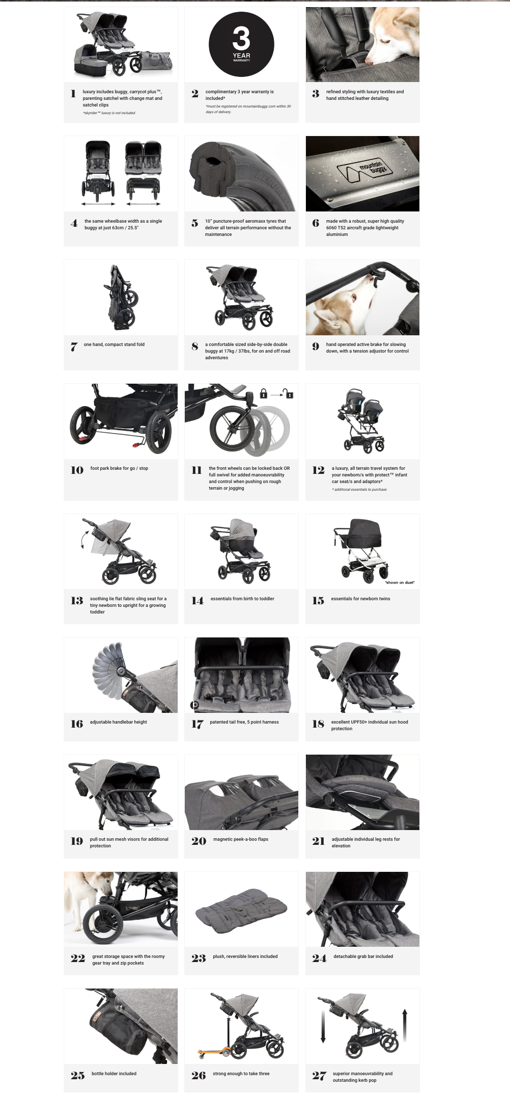 Puncture-proof tyres while maintaining the freedom of all-terrain -complete with aeromaxx tyres on all Mountain Buggy luxury buggies gives parents the hassle-free flexibility to explore