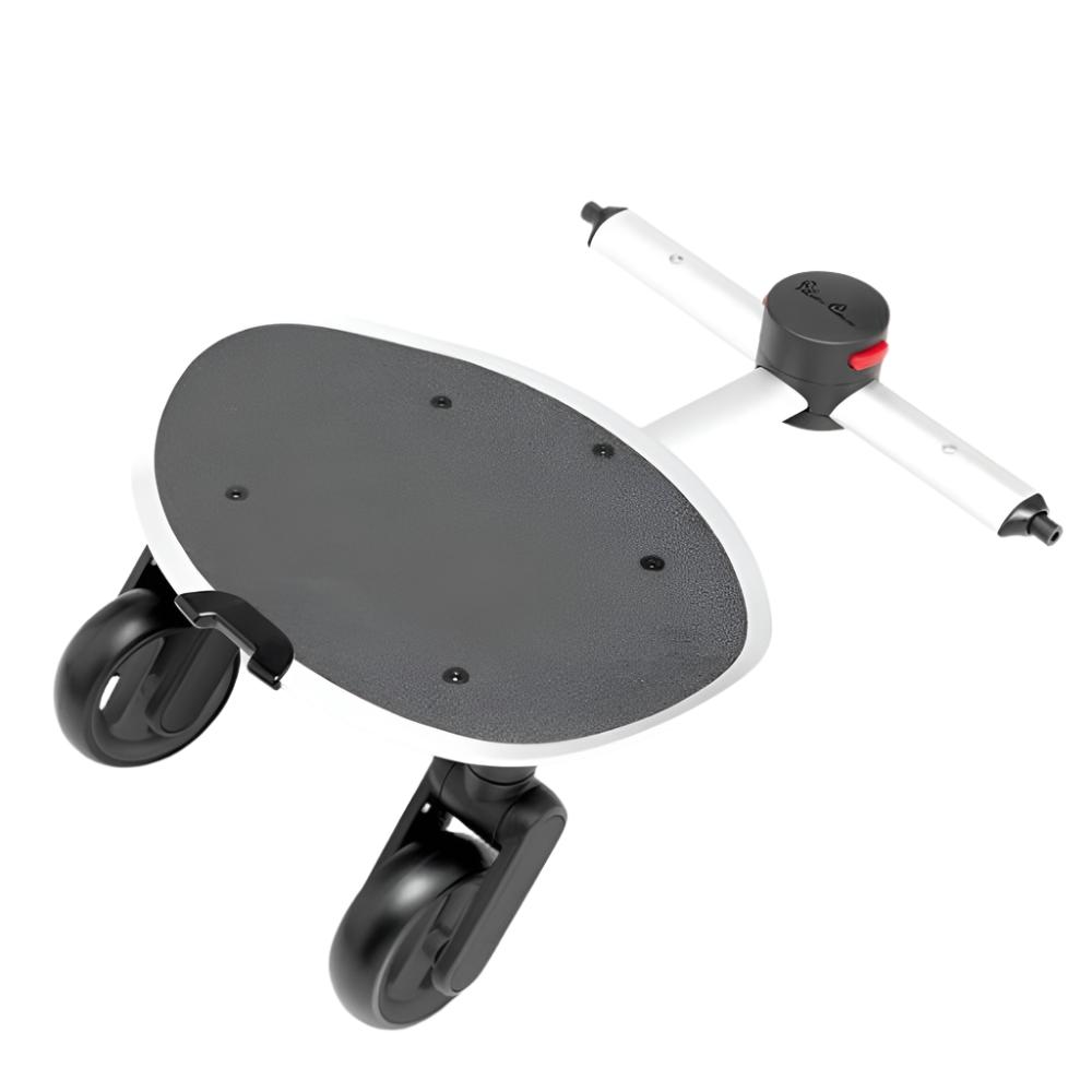 The Ride-On Board is compatible with Wave or Coast and connects in seconds with no extra fixing. It's finished in tough and durable aluminium with a coarse textured board surface for maximum grip. The Ride-On Board features two swivel wheels with puncture free tyres, and independent suspension for the most comfortable hop on ride. It also comes with a handy strap, which attaches to the basket of your pram system, allowing you to lift the board and store it vertically when not in use.